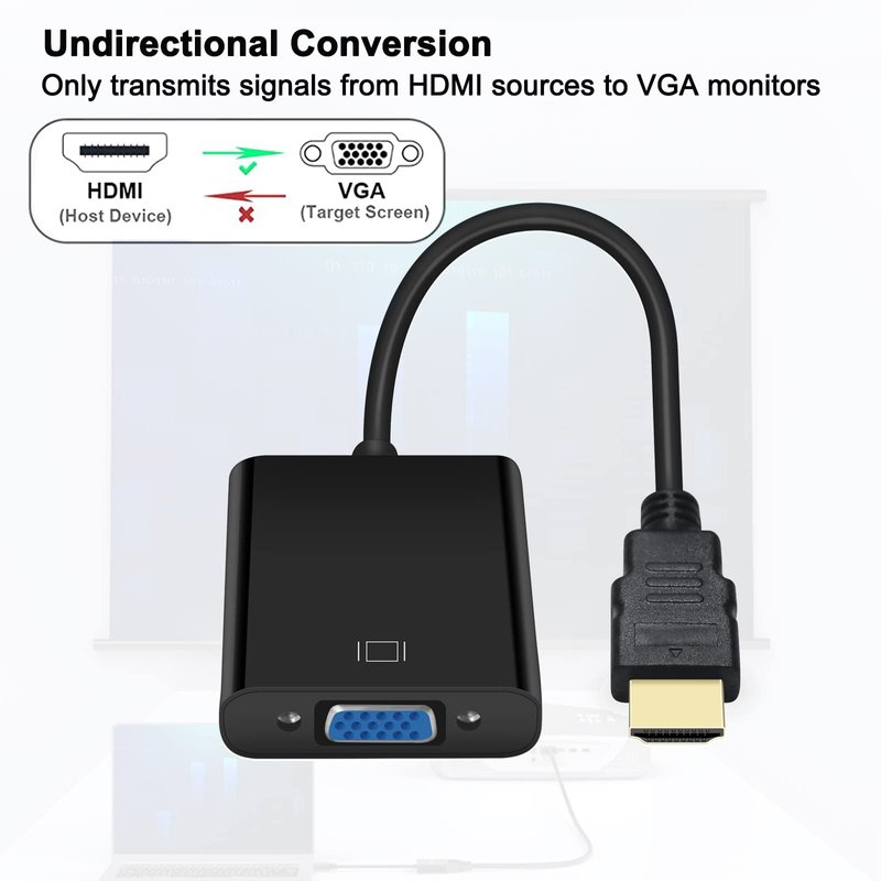 - One Way HDMI to VGA connector Conversion cable: HDMI male plug connects desktop computer, PC laptop, notebook, game console Xbox, PS3, DVD, cable box, etc.; VGA female socket for older monitor, projector, HDTV, etc.