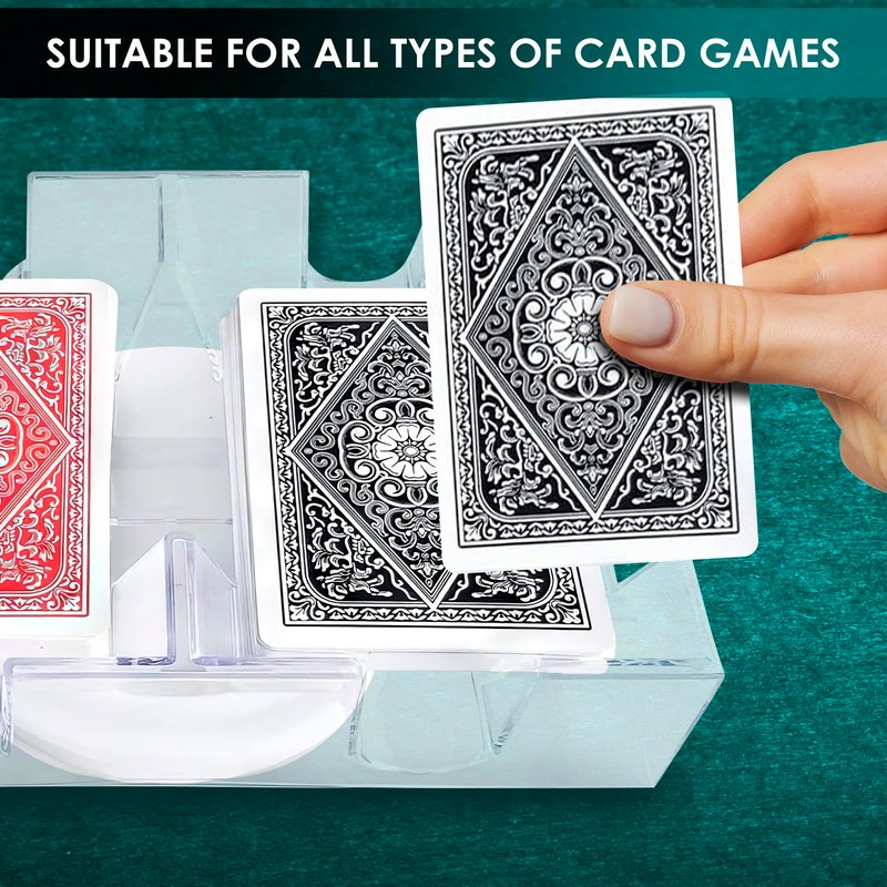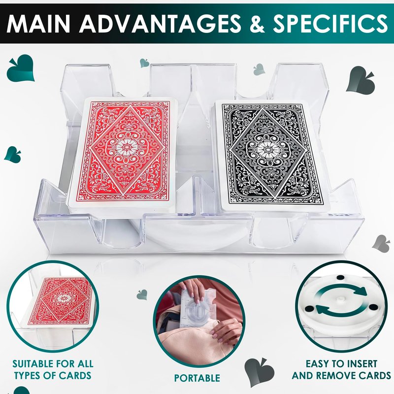 - Easy to Place Card Holders for Table: This card playing holder can holds 2 decks - one in each slotwide and narrow cards fit very easily, you can conveniently place and remove cards inside this clear playing cards plastic card holder. This plastic poker cards holder is very compact and portable for every time use and playing card case is also durable and lightweight so you can carry it with you in friends gatherings, clubs, bars, and anywhere.