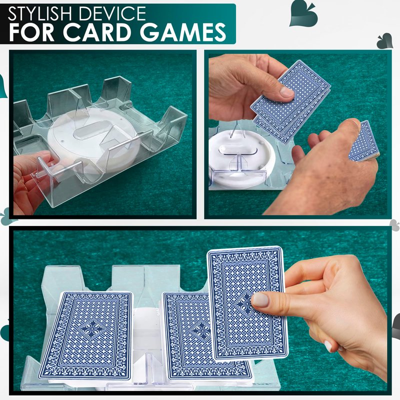 - Size of Playing Card Holder Tray: The canasta playing cards holder is 7.08 inches long. The table card holder stand is 4.84 inches wide and the height is about 2 inches. With transparent design of jumbo playing cards holder you can see the cards clearly. These kids card holders for playing cards will be right choice for you as this spinning card display can reduce the risk of missing card while playing various card games.