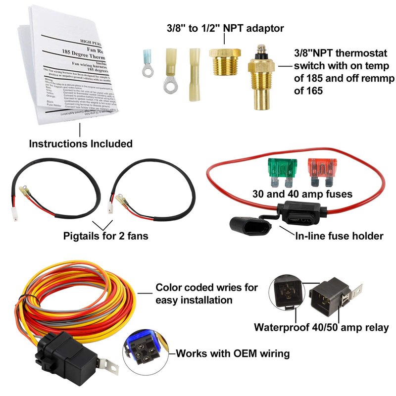 - Ⓞ This kit includes a waterproof relay, 3/8" (or1/2")NPT thermostatic switch (185* on / 165* off), and fuse block. For single fan setups. Perfect for your muscle car, 4x4, or hot rod!
