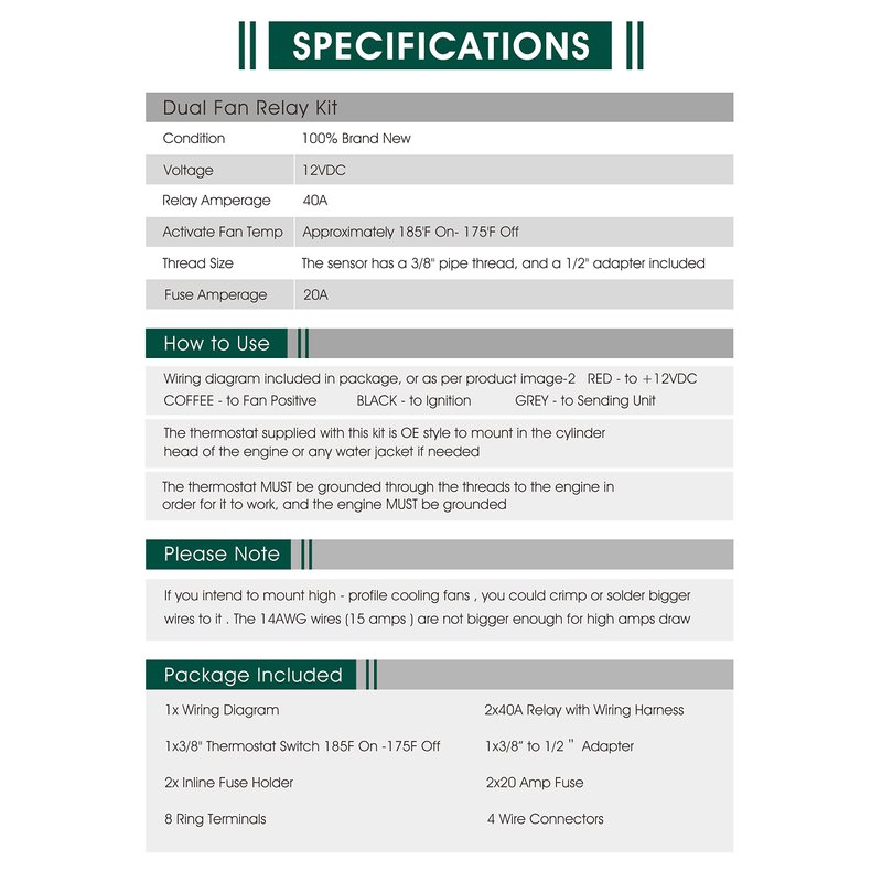 - Installation: For dual fan wiring, you would need two of this relay kit. Easy to follow wiring diagram simplify wiring your electric fans. RED to 12VDC positive battery terminal, COFFEE to Fan Positive, BLACK to Ignition, GREY to Sending Unit per wiring diagram. Direct replacement part fits 10, 12, 14, and 16 inch cooling fans.