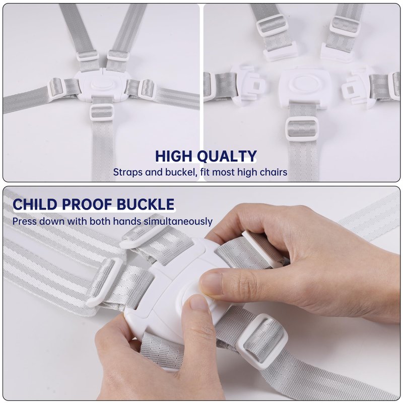 SECURE AND CONVERTIBLE The chair straps for toddlers come with both 5-point harness to accommodate different sizes for children of different ages. They include a high-quality buckle that's easy for adults to use but hard for babies to unfasten, which is safe for the babies. STANDARD SIZE AND ADJUSTMENT LENGTH The high chair harness is 26.37 inches long and 0.98 inches wide; both side straps are 22.04 inches long and 0.98 inches wide; the lower harness is 18.11 inches long and 0.98 inches wide; product weight: 120g The length of the chair straps for toddlers can be adjusted while attaching to the dining chair. The nylon strap is colorfast, environmentally friendly, safe and reliable. WIDE APPLICATION Easy to put on and take off, our high chair straps replacement is designed to work with most popular high chairs, pram, buggy, baby strollers and push chairs. Perfect addition to high chairs for day care centers, restaurants, hotels, or virtually any business that serves children. DURABLE AND COMFORTABLE The high chair harness seat belt is made of durable, high-density nylon webbing that resists damage while remaining smooth and comfortable against your baby's skin. LIGHTWEIGHT AND EASY TO CARRY You can bring the 5 point harness high chair wherever you go since it is lightweight and easy to carry. Where there are high chairs or strollers, take out the seat belt and secure baby comfortably in the chairs.