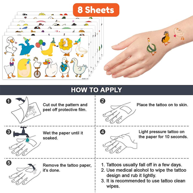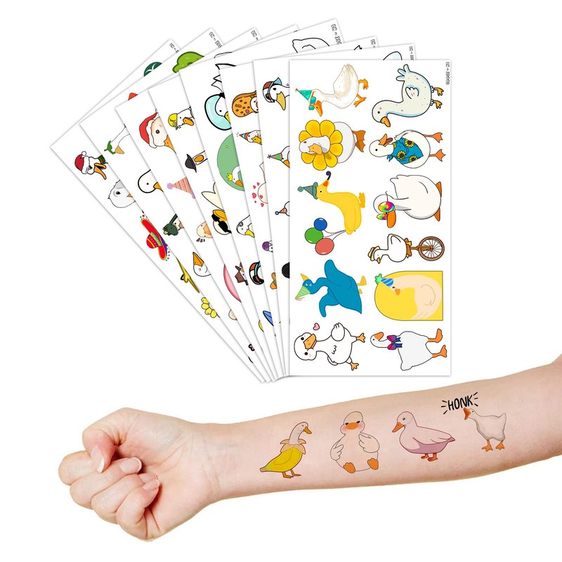 - Including 8 sheets tattoos with various styles, sufficient in quantities and colors to meet your daily requirement of using and sharing. You guys can easily use this set of Duck temporary tattoos and take unique photos to make fond memories.