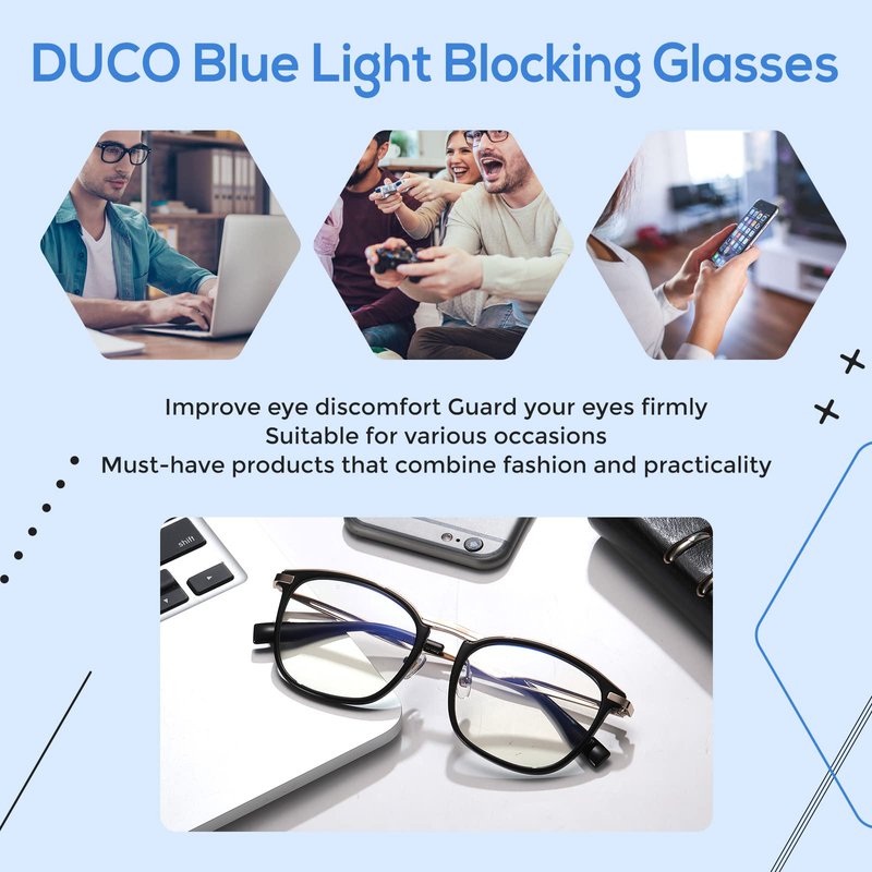 - 👓【EXCLUSIVE BLUE LIGHT GLASSES DESIGN】: The latest blue light blocking glasses designed by DUCO, a functional eyewear company. Made of innovative TR90 material with metal frame. The streamlined metal covers the upper edge of the computer glasses, which flashes with different metallic luster in different light conditions, which is full of fashion sense. Whether it is at home or in the office, it is the best choice for you to show yourself.