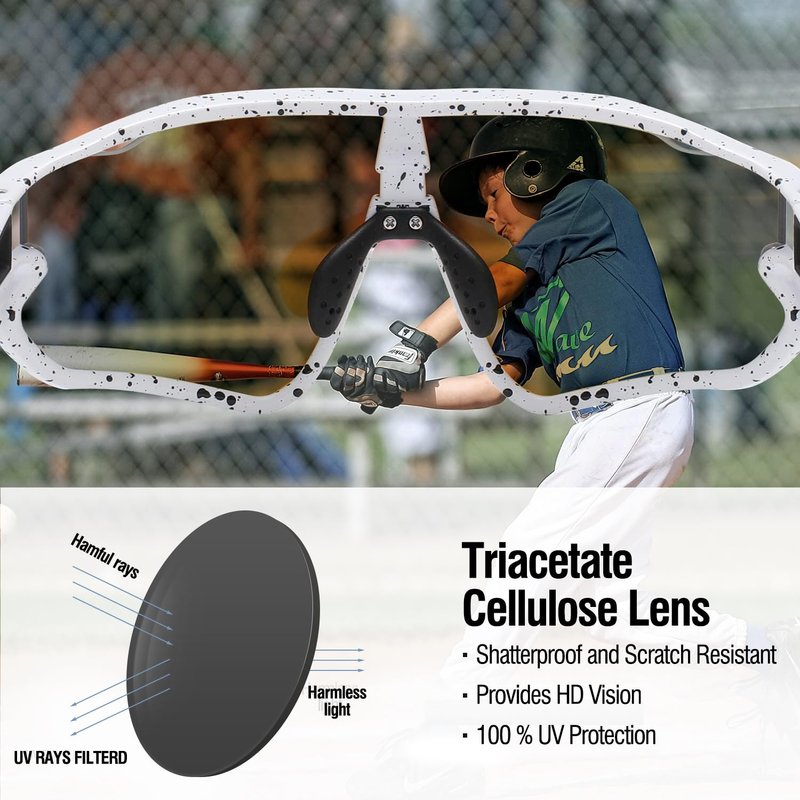 - 【DESIGNED FOR SPORTS】 -- These youth sports sunglasses offer 100% UV protection and clear vision,making them ideal for outdoor sports,such as baseball,softball,climbing,driving,fishing,golf,hiking,running skiing,cycling and so on.