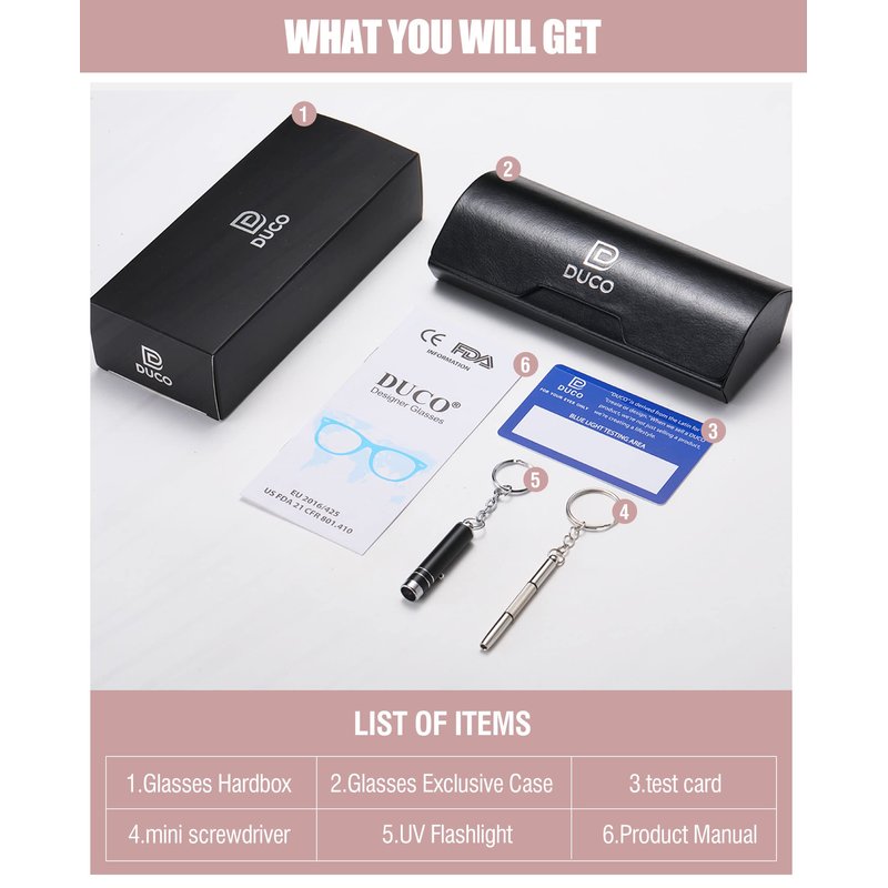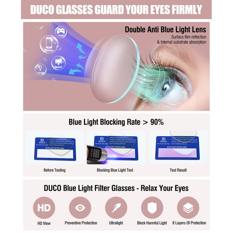 - 👓【HIGH QUALITY NYLON LENSES】 DUCO's newly developed blue light blocking glasses use first-class nylon lenses, which have higher elasticity and excellent optical quality than ordinary lenses in the market. The weight is only one-tenth of the same volume of glass, and only half of the weight of traditional resin lenses. The first choice for high-end glasses.