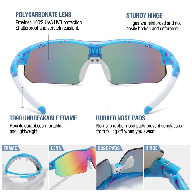 - 【JOY & EXPERIENCE TOGETHER】- Three-stage temple design. At first, the first section hinge with mini screws firmly connected, moreover, the middle section for the shield hole design, the third section for the comfortable silicone protective pads, non-slip and skin-friendly. Play and eye protection into one pair of sunglasses.