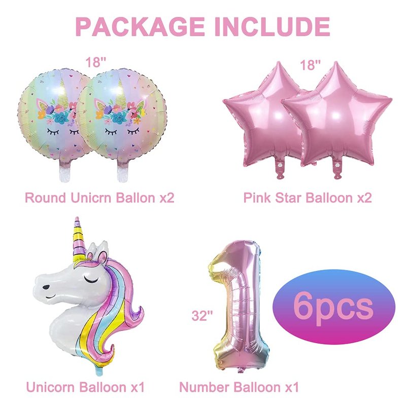 - Unicorn Foil Balloon Set: Iridescent Unicorn Balloon x2, Large Unicorn Rainbow Balloon x1, Pink Star Balloon x 2