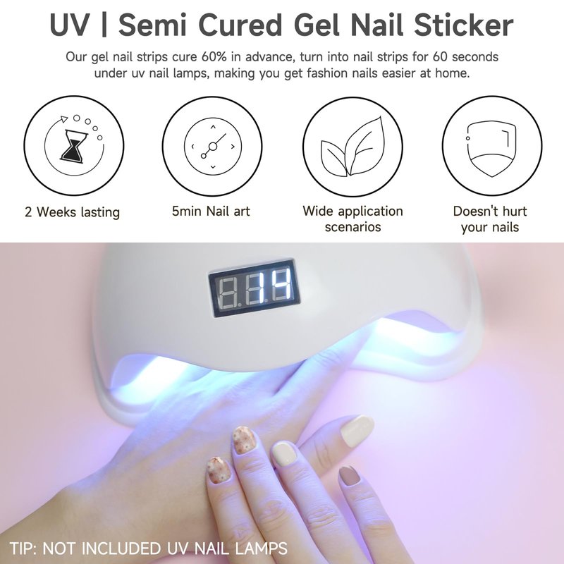 - 14 DAYS LONG LASTING: UV Gel nail strips are suitable for use with any UV nail lamp (Not Include UV Nail Lamps). The gel nail stickers can be more reinforced by UV nail lamp. Lasts up to 14 days. (Note: The length of maintenance time has an impact on personal living habits)