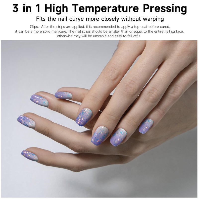 - Make a pair of hands in one minute-DIY nail strips making operation is simple, you only need to spend one minute to stick the gel nail sticker on the nail, (Tips:After the gel manicure stickers are applied to the nails, it is recommended to apply a layer of reinforcing sealer in the baking lamp, so that it can be a more solid manicure.) The nail polish stickers cover is also easy to peel off, just lift the gel nail sticker with the tip of the wooden stick included in the package.