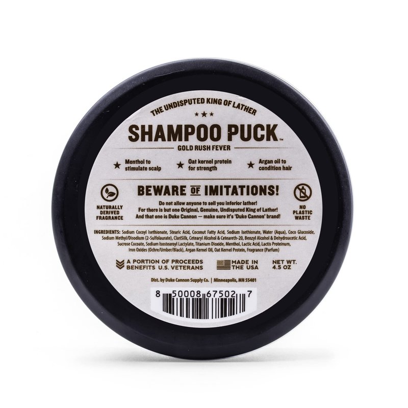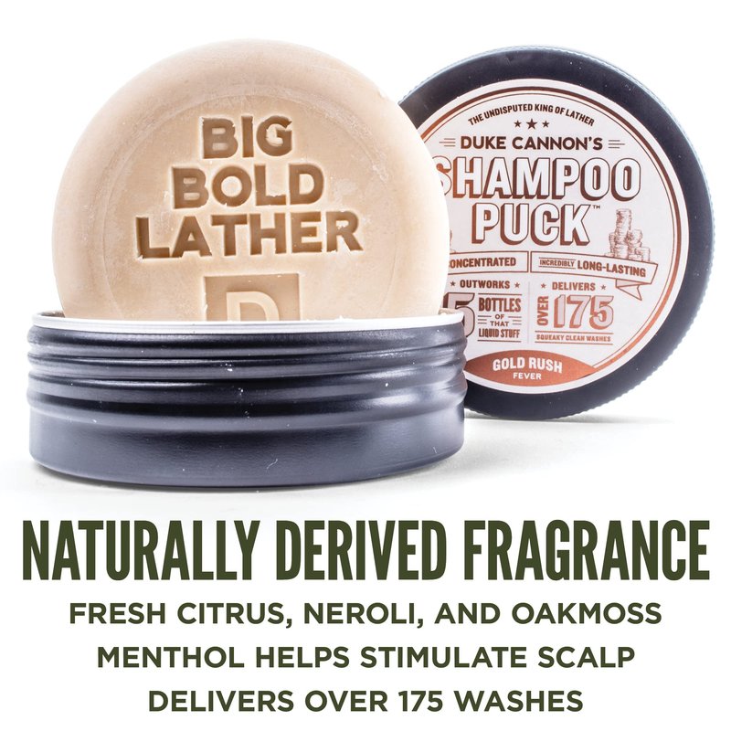 - Premium Lather, Solid Bar: Duke Cannon’s Gold Rush Fever Shampoo Puck delivers a rich, bold lather in a super-concentrated solid bar, designed to outlast 5 bottles of liquid shampoo.