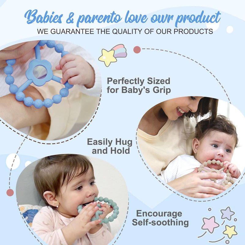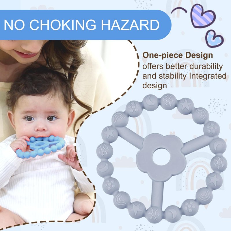 - UNIQUE RING FOR BABY TEETHING TOYS: Our adorable baby teething toys have a unique pattern texture and round hollow out design. Patterns include stars, moon, snowflakes, clouds, etc., the pattern is three-dimensional, vivid and fun. The baby teethers center is flower hollowed out design, easy for baby's grip and not easy to damage or deform. One-piece design, all parts are tightly connected, no removable small parts, will not cause choking hazards.