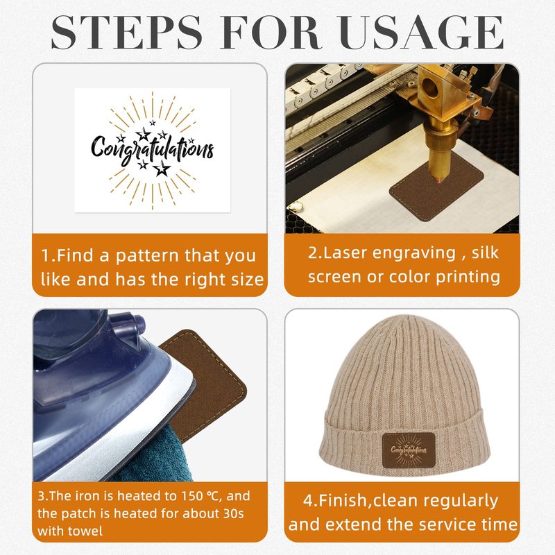 - Note: picture for reference only; The pattern will appear black after laser engraving, the color pattern effect requires screen printing or color printing; The patch cannot be adhered to materials such as sweaters, suede and so on, check the material before use; It is recommended to use an iron at 150-160 degree centigrade for about 15 seconds; It can be heated from the front or back, please cover the leather with a protective cloth, but heating from the front will risk blackening the leather