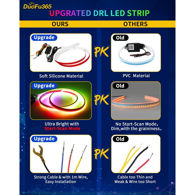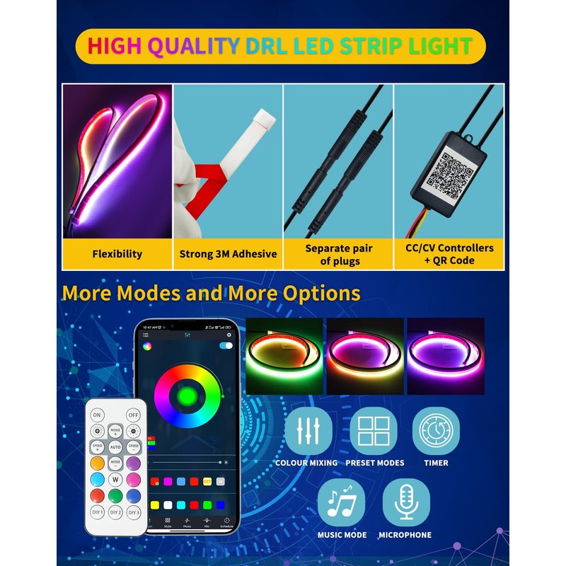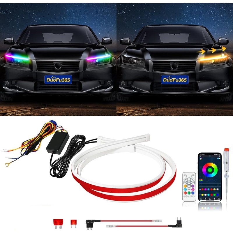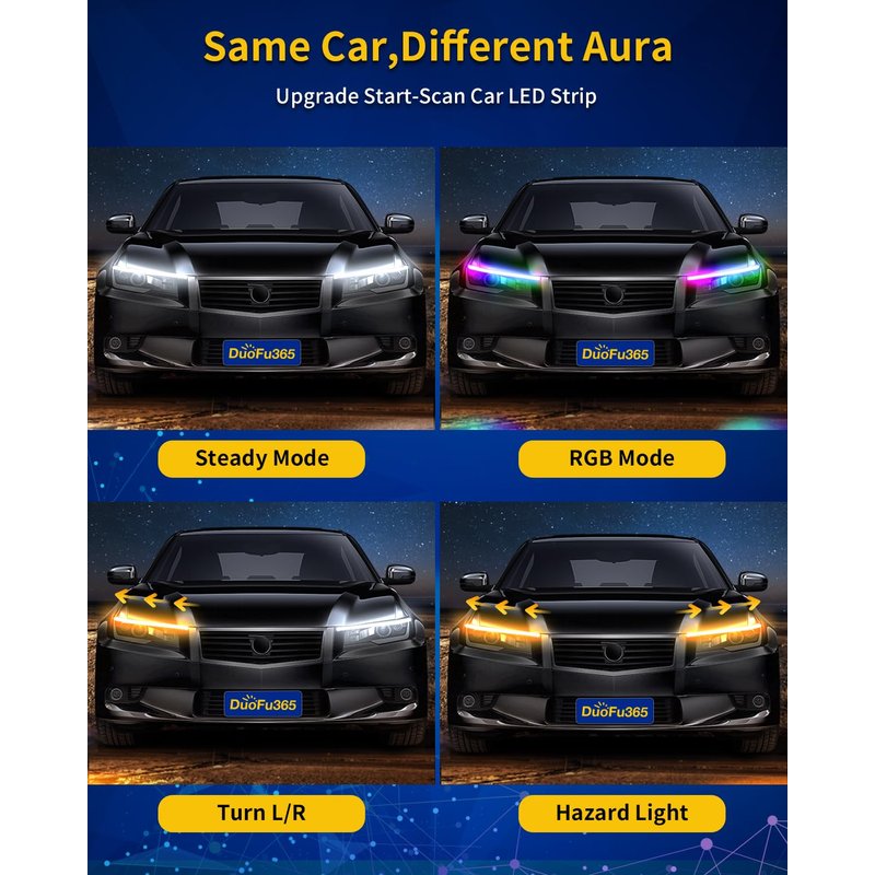 - 🚘【New Upgrated RGB DRL LED Strip】with Turn Signal Function and Dynamic Scan Start Up,it will switch yellow lights when turning.quality assurance,heat dissipation quickly,lasting lighting.Make your car engine cover get more eye-catching, increase the lighting when you drive at night,Improve your driving safety in rainy or foggy days etc.