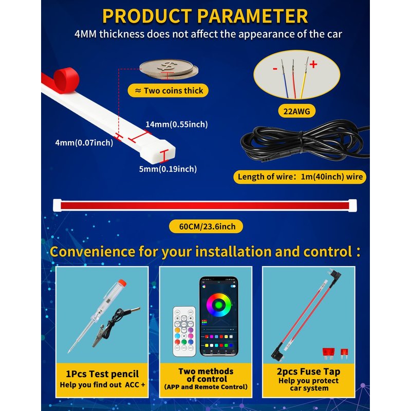 - 🚙【Package Includes】2*DRL LED Strip Light; 2*Fuse Tap Adapters & 10Amp fuses;1* Test pencil;1*User manual;4* Ties.No need to buy or find other accessories
