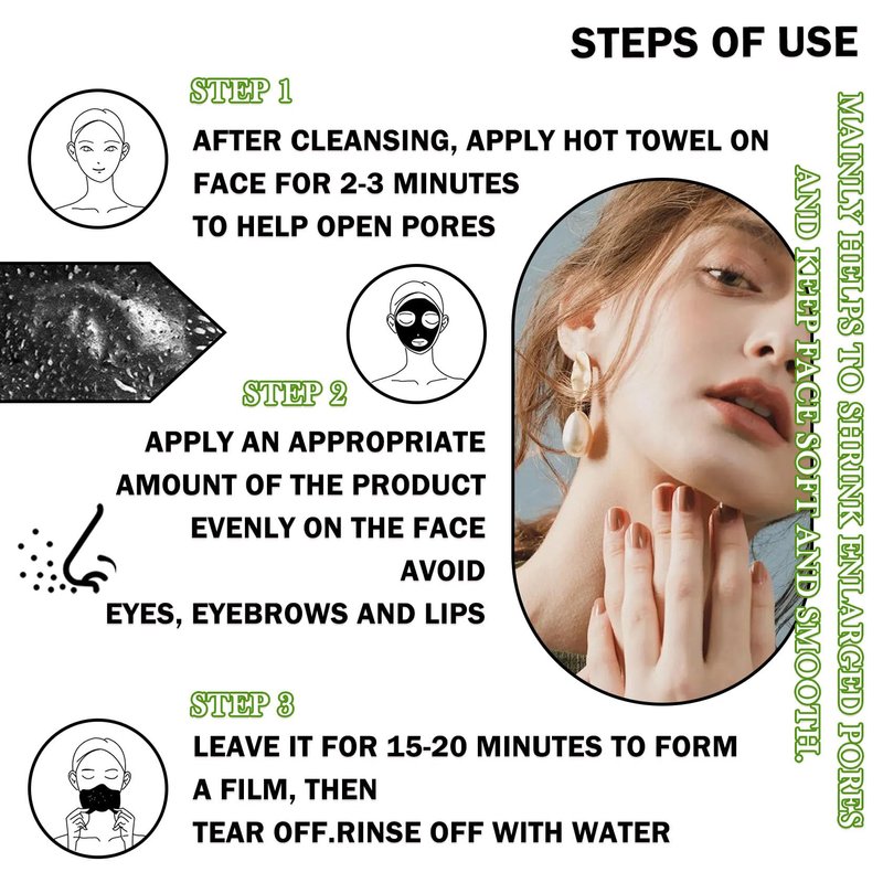- 🎈【How to Use】First, clean your face and apply hot towel or steam on your face to open your pores for about 2-3 minutes. Then take an appropriate amount of the product evenly coated on the face, wait 15-20 minutes to form a film after tearing off, followed by rinsing with water, and finally use the pore shrinker to shrink pores can be.