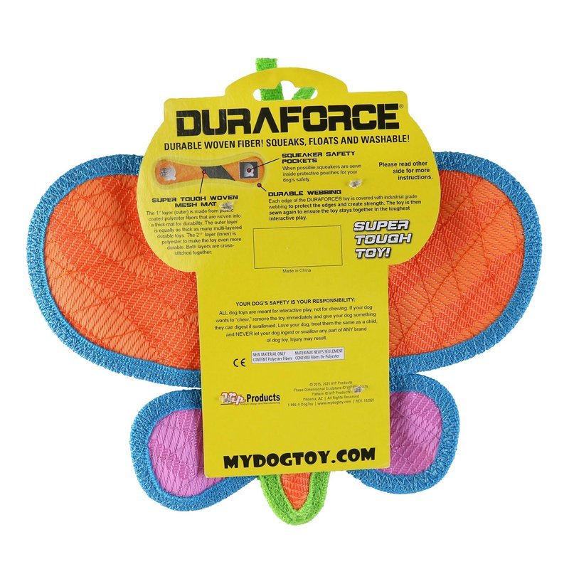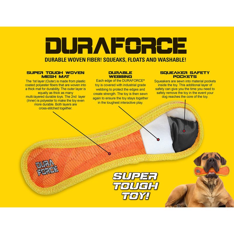 DuraForce toys are made with durability in mind! The outer layer is made from plastic coated polyester fibers that are woven into a thick mat for durability. The inner layer is made from polyester. Both layers are cross-stitched together to create strength. Each edge of the DuraForce toy is covered with industrial grade webbing to protect the edges. The toy is then sewn again to ensure it stays together in the toughest interactive play. Squeakers are sewn inside protective pouches for your dog’s safety. DuraForce toys are built to withstand rigorous interactive play, not aggressive chewing. We use quality, durable materials, but this product is still a “soft” plush dog toy that can be damaged from chewing. Care for your dog like you would your child. Do not allow your pet to swallow any part of ANY brand of dog toy.