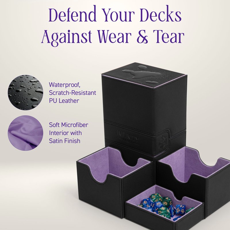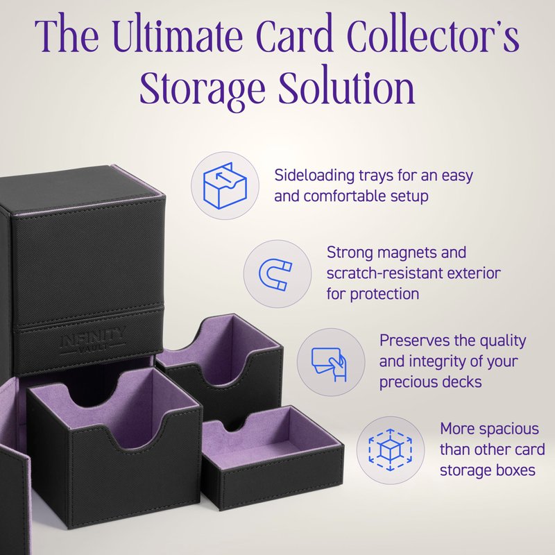All our products at InfinityVault are designed with the highest quality standard. This deck box in particular was designed to first and foremost protect your cards, from its strong damage-resistant exterior with magnetic box closure, to its soft interior, including spacious trays that will not be the cause of scrunched card corners or sleeves.