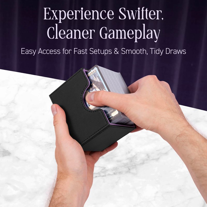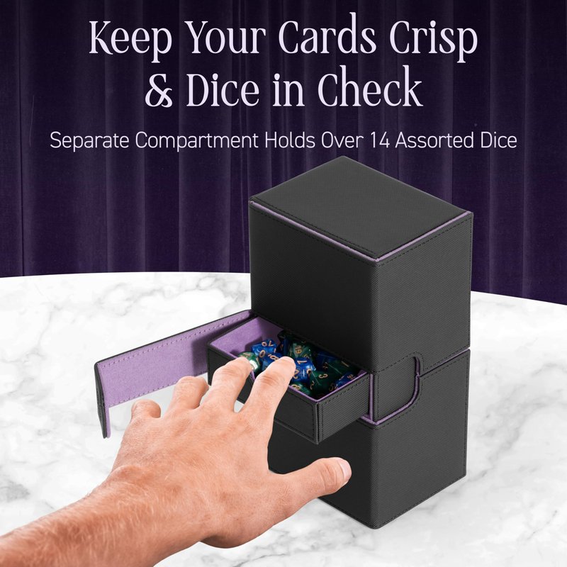 - Convenient, All in One Deck Box - Everything you need for game time fits in this box. We improved upon the capacity of other deck boxes, to make sure this box comfortably stores at least 100 Double Sleeved cards in each of its two sideloading card trays, and it includes an accessories tray to accommodate your needs for dice, tokens, counters, and/or simply extra card storage space.