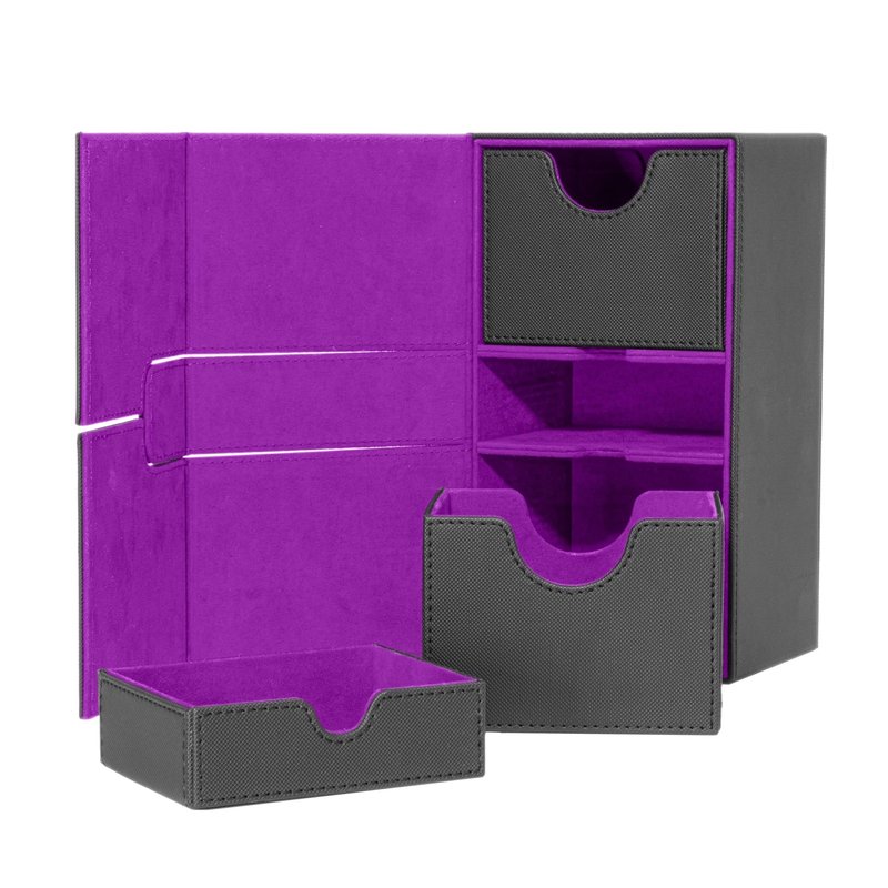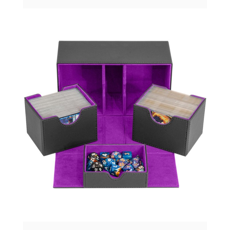 - Convenient, All in One Deck Box - Everything you need for game time fits in this box. We improved upon the capacity of other deck boxes, to make sure this box comfortably stores at least 100 Double Sleeved cards in each of its two sideloading card trays, and it includes an accessories tray to accommodate your needs for dice, tokens, counters, and/or simply extra card storage space.