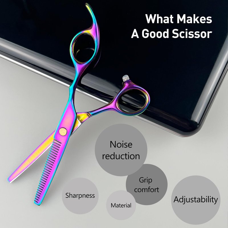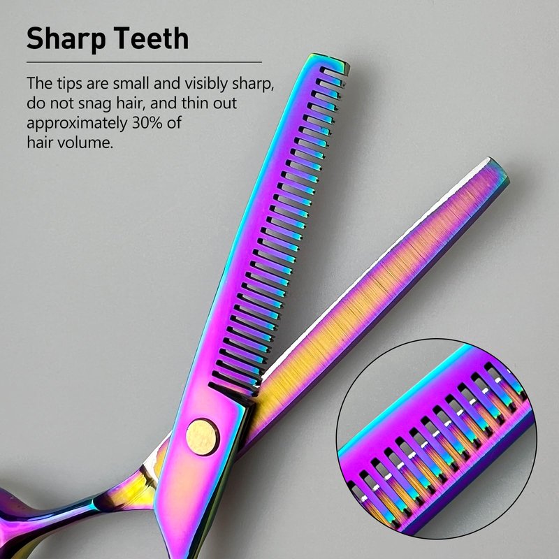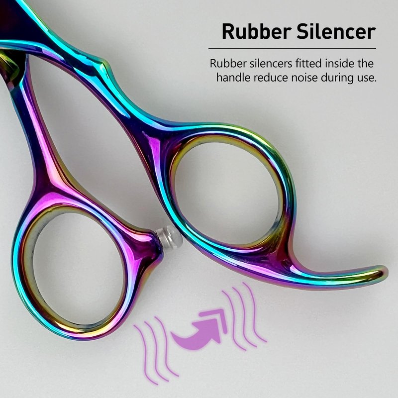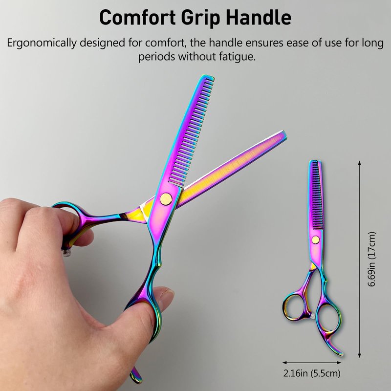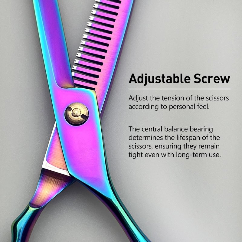 Our Rainbow Hair Thinning Scissors are crafted from premium Japanese stainless steel, ensuring a sharp, long-lasting, and corrosion-resistant cutting experience. At 6 inches in length, these versatile scissors are perfect for professional salon use, home grooming, or texturizing for both adults and children, as well as pets. The ergonomic handle is designed to reduce wrist strain and provide a comfortable, controlled grip, making these shears a top choice for daily use.These scissors combine the durability of superior materials with an ergonomic design that ensures comfort during prolonged use. The precision-crafted blades offer smooth, razor-sharp cutting for effortless hair thinning. Whether you're a professional stylist or looking to enhance your home grooming toolkit, these rainbow-colored thinning shears bring a touch of style and exceptional performance.
