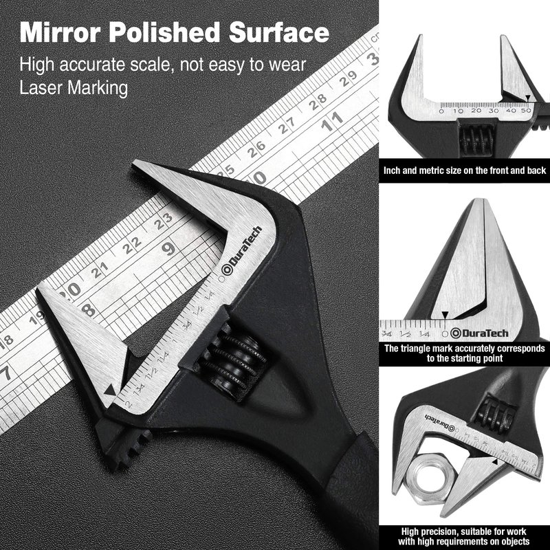 DURATECH 10-Inch Adjustable Wrench, Wide Jaw Opening Black Oxide Finish Plumbing Wrench, CR-V Steel, SAE and Metric Scale Marked, Ergonomic Grip