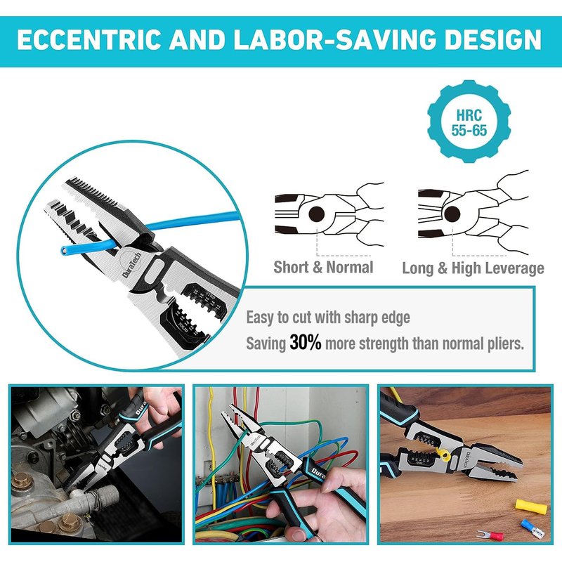 - 【Labor-saving and Sharpness】Eccentric and labor-saving design, extremely labor-saving when cutting. The overall hardness of the combination pliers is 35-50HRC, and the hardness of the cutting edge is 55-65HRC. Easy to cut with sharp edges, save 30% force than ordinary pliers.