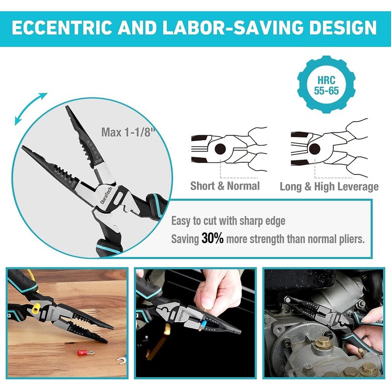 - 【Labor-saving and Sharpness】Eccentric and labor-saving design, rivet moving closer to cutting edge, adds more gripping and cutting power. The overall hardness of the combination pliers is 35-50HRC, and the hardness of the cutting edge is 55-65HRC. Easy to cut with sharp edges, save 30% force than ordinary pliers.
