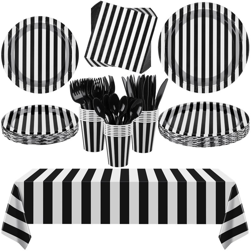 durony 113 Pieces Black and White Striped Party Supplies Table Decorations Includes Paper Napkins Cups Plates Knives Forks Spoons Tablecloth Disposable Tableware Set for Birthday Graduation Wedding