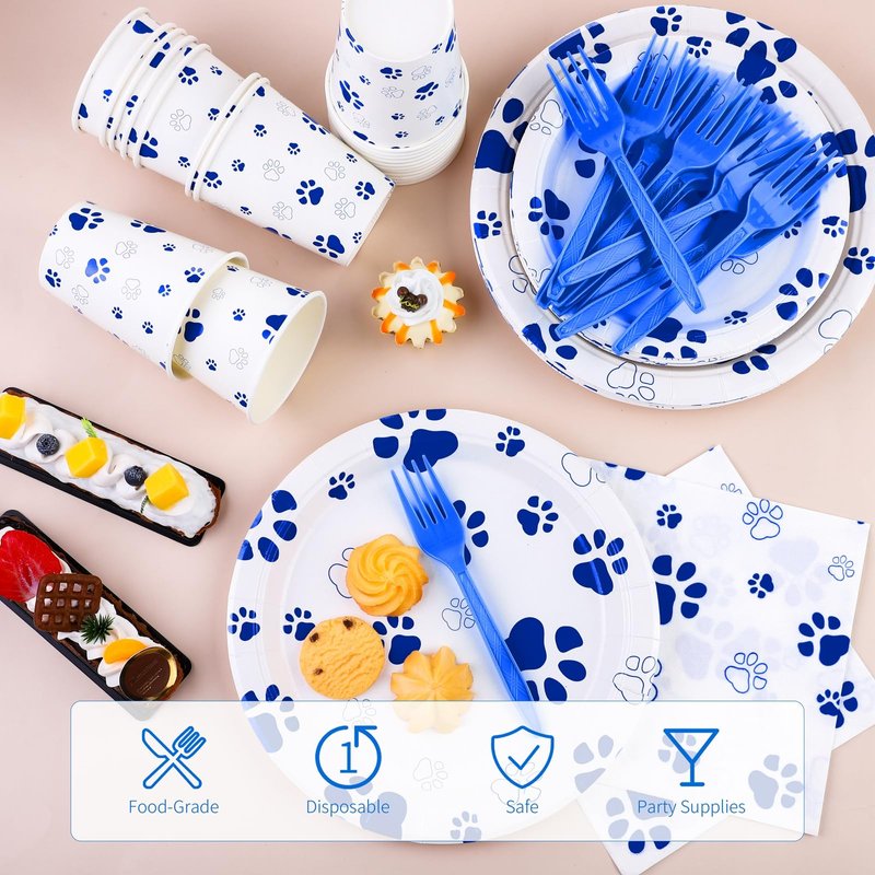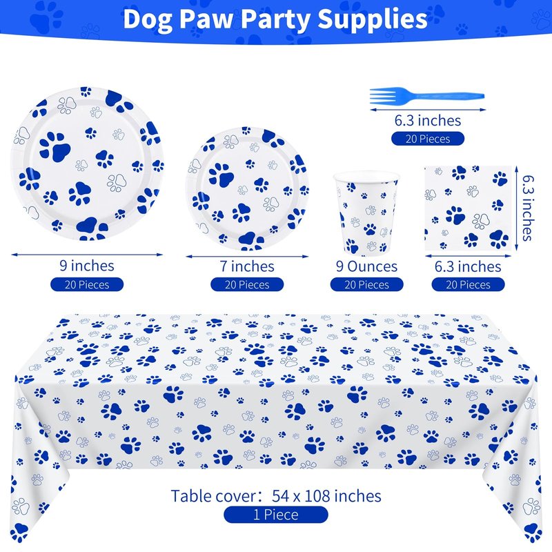 - Package includes: you will receive a complete blue-white dog claw party tableware set, including 20 pieces of 7-inch plates, and 20 pieces of 9-inch, 40 pieces of napkins, 20 pieces of 9-ounce paper cups, 20 pieces of forks, and 1 pack of the disposable plastic tablecloth, a total of 121 pieces, sufficient and convenient for your party use