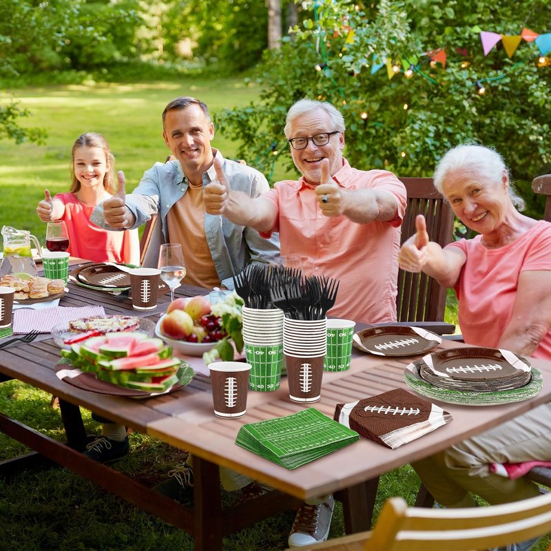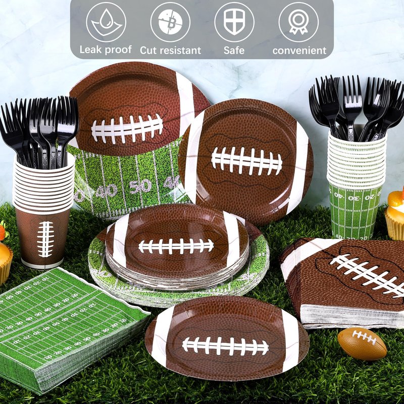 durony 144 Pieces Football Party Supplies Tableware Set Disposable Paper Plates and Napkins Forks Serve 24 Guests Football Table Buffet Decoration for Football Birthday Party Supplies