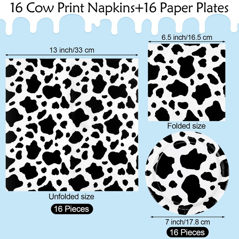 - Package includes: you will get 16 pieces of cow print paper plates of 7 inches, and 16 pieces of cow print paper napkins with 3 layers, measuring about 13 x 13 inches/33 x 33 cm when unfolded, folded in approximately 6.5 x 6.5 inches/16.5 x 16.5 cm; 32 pieces in total, sufficient for cow print party supplies