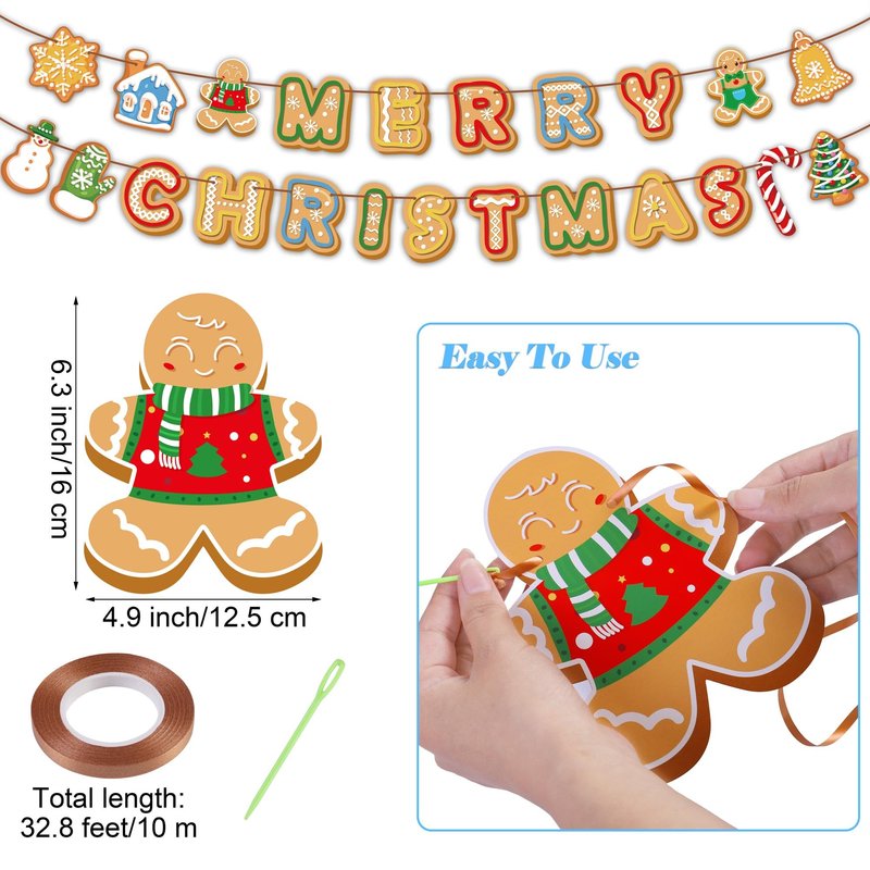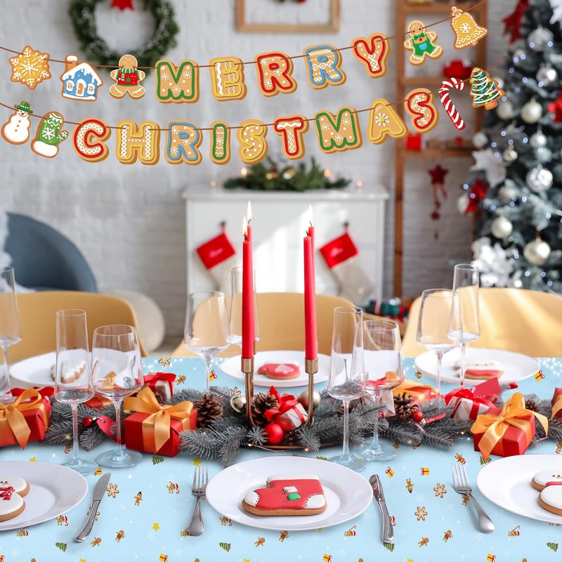 - Christmas Themed Design: Our Christmasgingerbread man plastic tablecloth set features various Christmas elements including gingerbread men, Christmas trees, snowflakes, gingerbread houses, candy canes, and the classic "Merry Christmas" in colors such as red, blue, and white. Easily create a vibrant party atmosphere that will make your party more attractive. The gingerbread man shaped triangle banner is an amazing addition, adding an elegant touch and warmly welcoming your guests.