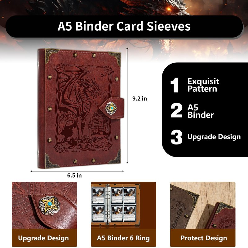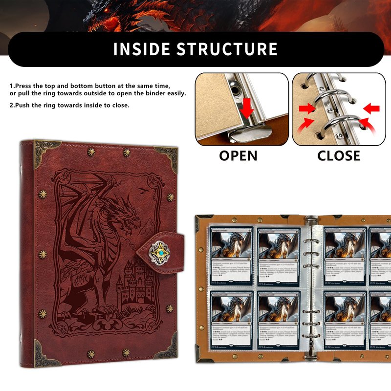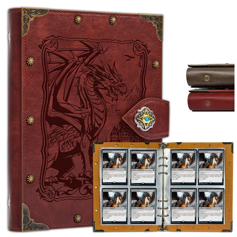 - Unique Design:Rivets with vintage faux leather complete the overall look.using embossed pattern design brings true touch,Not just printed.with metal rivets bounded around the entire cover (front and back),there are 8 pcs metal book corners covered which can protect the Card Binder better.A great collectors accessory to increase any card enthusiast experience with immersive hints by the look.