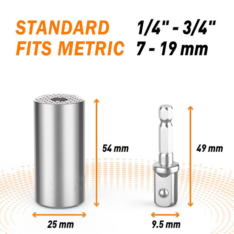 - 🔧Auto-adjust Design - The unique design of the Dusor universal socket tool can automatically adjust to any size or shape to meet all your needs. The universal wrench fits standard 1/4'' to 3/4'' and metric 7 to 19 mm screws, nuts, and blots. The tool is Equipped with a 3/8" power drill adapter, and it is easy to connect with most electric drills, electric screwdrivers and manual ratchet wrenches.
