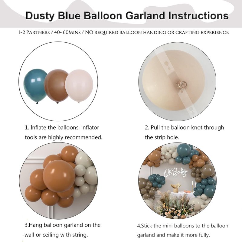 - Blue Brown Tan Balloon Garland Kit: total 128 units with 37 beige balloons, 37 brown balloons, 32 slate blue balloons, 22 tan balloons, 1 balloon strip, 2 balloon ribbon, 100 glue dots.