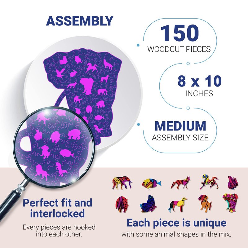 - THEY are Irregular and Unique Puzzles - The pieces are well crafted, cut from high quality wood and each piece really feels like art. It consists of 150 pieces of irregular shape and some are cute little animal like elephant. Finished Dimension: 8 by 11 inches. Material: Wood