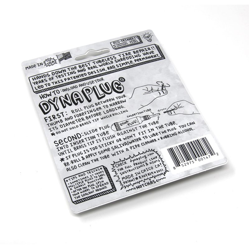 These are DYNAPLUG BICYCLE TIRE REPAIR PLUGS. Dynaplug Bicycle Tire Repair Plugs are a sealant-friendly, unique viscoelastic impregnated rubber that bonds instantly and permanently with your tire, and the nonabrasive brass tip will not scratch your rim or puncture your rim tape. No need to remove the tire, no messy glues or solvents, just plug and ride! Depending on the type of puncture, choose SOFT, MEGA or POINTY. Dynaplug is the fastest, easiest and all-round best way to repair a tubeless tire mid-ride. When needed, just move whatever caused the puncture, firmly push the novel insertion tube straight (without twisting) into the hole and extract the tool depositing the repair plug in the tire, done! Made in the USA.