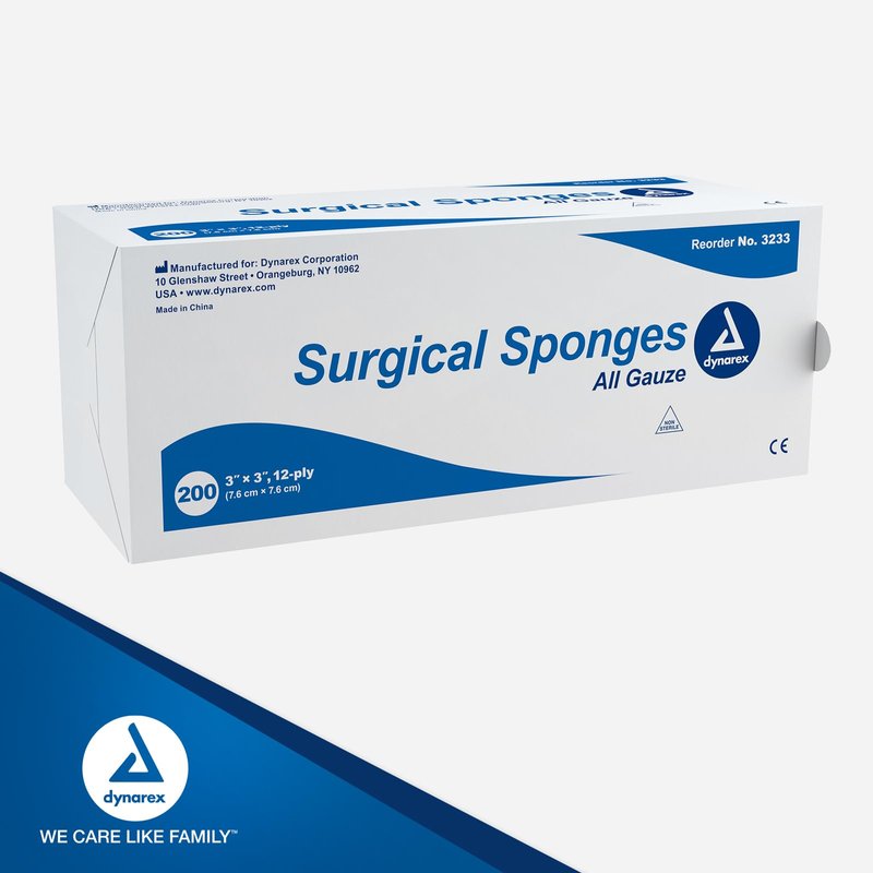Dynarex Surgical Gauze Sponges- Absorbent Cotton Fabric with Folded Edges - Soft, Durable, Non-Sterile Dressing - 3x3, 12-Ply - Sleeve of 200 Sponges