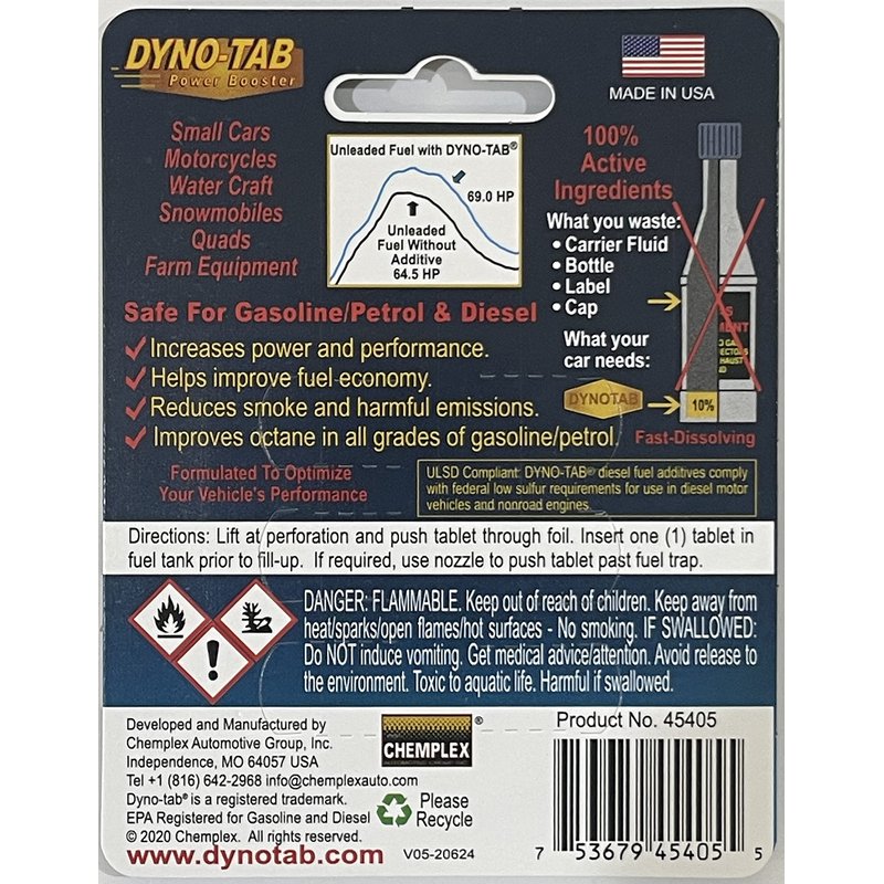 Dyno-tab Fuel Treatment is a safe, fast dissolving fuel additive in tablet form that is made from 100% active ingredients. Dyno-tab eliminates the fluid carrier component of most fuel additives and dramatically reduces transportation costs, storage requirements and packaging waste. In this regard, Dyno-tab is better for the environment. Dyno-tab fuel treatments contain a combustion catalyst that, when added to fuel, produces a cleaner and more complete fuel burn. In addition, Dyno-tab inhibits the buildup of carbon deposits within the combustion chamber and on exhaust valve surfaces, which rob your engine of power and performance. Dyno-tab is added directly to the fuel tank at fill-up where it dissolves quickly and completely. Dyno-tab is designed to: Increase power and performance Boost octane Help improve fuel economy Reduce smoke and exhaust emissions Eliminate ‘knock’ & ‘ping’ Inhibit carbon deposits As with any additive, results will vary. Dyno-tab is registered with the EPA and is safe and effective for all gasoline and diesel engines. It will not harm catalytic converters or oxygen sensors.