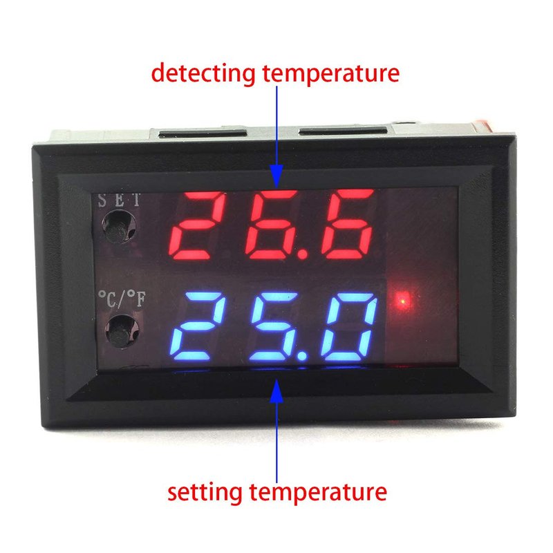 - Temperature controller monitoring instrument, show the measured temperature (red) and set temperature (blue) at the same time. Can be used for cooling/heating control. Operating Voltage: DC12V 200mA