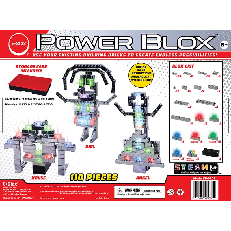 - AWESOME PROJECTS - Build circuits directly into your projects and light up your 3D circuits with our unique power block. E-Blox use our patented technology, which consists of tin-plated blocks that connect to a battery block, powering the electrical component blocks. The plated blocks used in our Power Blox TM line allow you to seamlessly integrate electronic circuitry into your builds so there are no wires to bundle and hide. All you need is one (1) 9V battery and it's good to go!