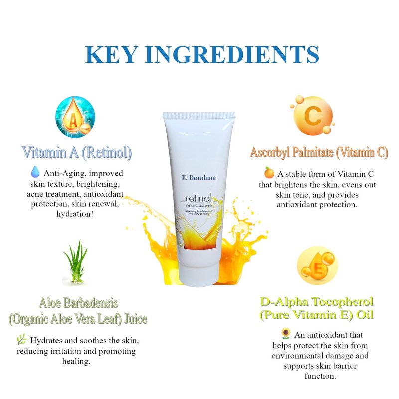Unveil a radiant and rejuvenated complexion with E. Burnham's Retinol Vitamin C Face Wash. This refreshing facial cleanser harnesses the power of natural herbs to gently cleanse and revitalize your skin. Enriched with organic rose extract and soothing aloe vera, it effectively removes impurities while promoting a brighter, more youthful appearance. The potent blend of retinol and vitamin C works in synergy to combat signs of aging, diminish fine lines and wrinkles, and restore a vibrant glow. Experience a luxurious cleansing ritual that leaves your skin feeling refreshed, nourished, and radiant. With its 4 oz size, this face wash offers a convenient and indulgent addition to your daily skincare routine. Unveil your most beautiful, luminous self with every wash.