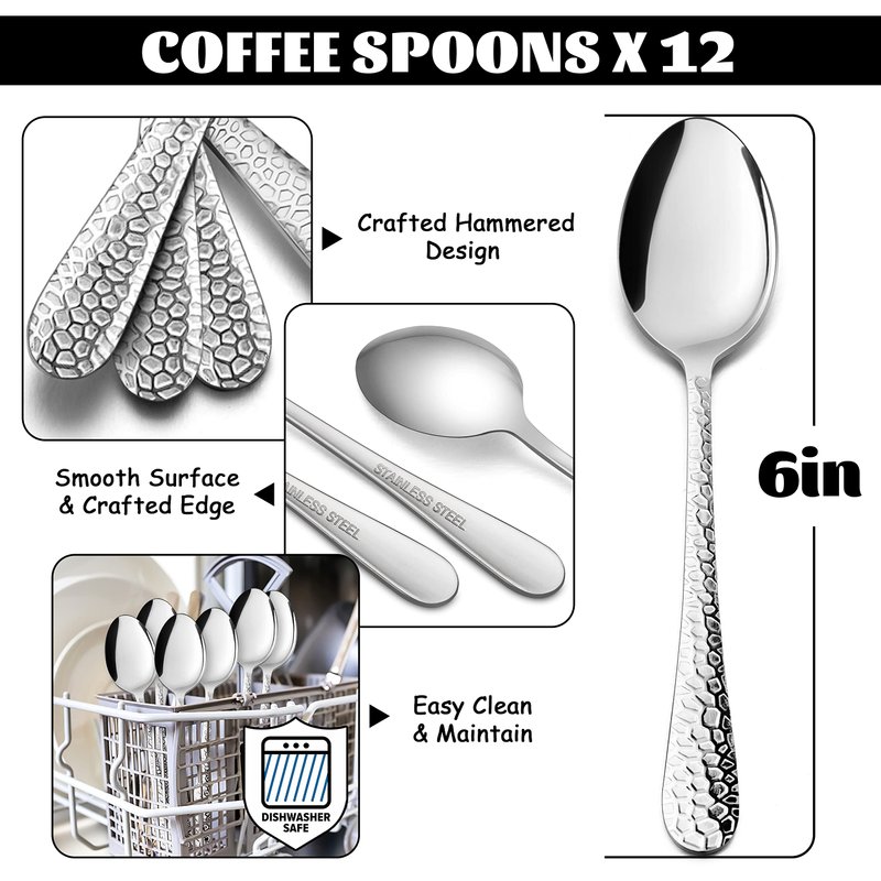 E-far 12-Piece Coffee Spoons, 6-Inch Stainless Steel Espresso Spoons, Small Metal Spoons for Coffee/Sugar/Tea, Hammered Design & Rust Free, Dishwasher Safe