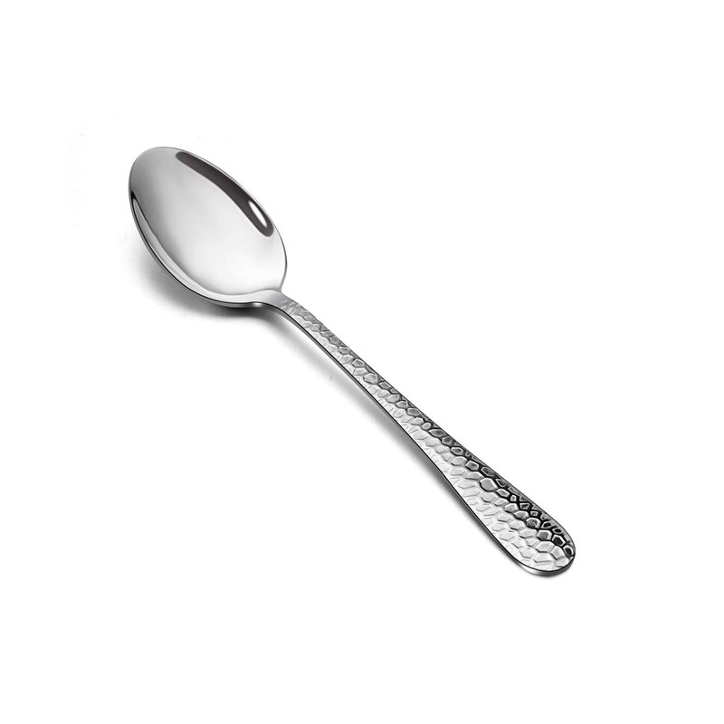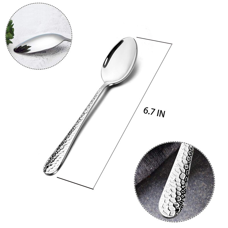 These teaspoons made using of high quality stainless steel. With an ergonomic classic hammered design and an elegant curved design provides long-lasting performance. Suitable for daily use and all occasions, whether setting a table for brunch or afternoon tea with friends. The 6.7 inches size was perfect, not to small and not a huge serving spoon and plain appearance enough to match your other silverware.