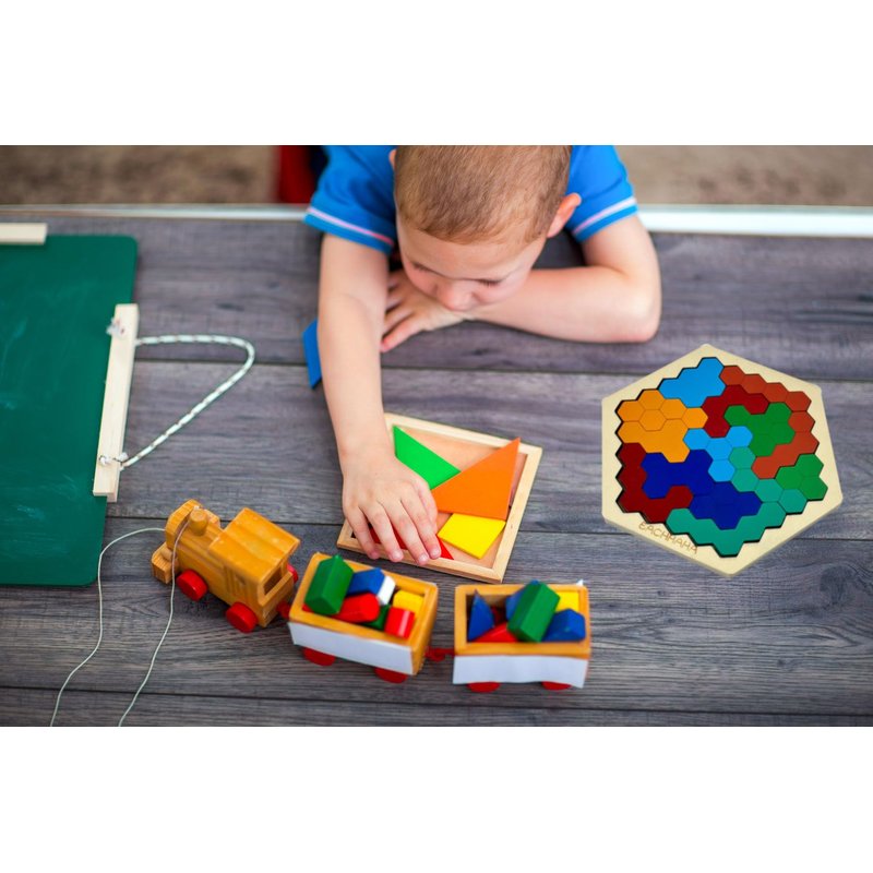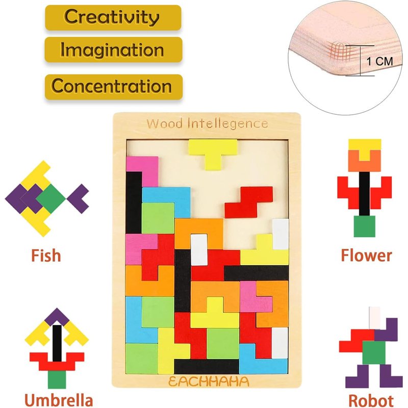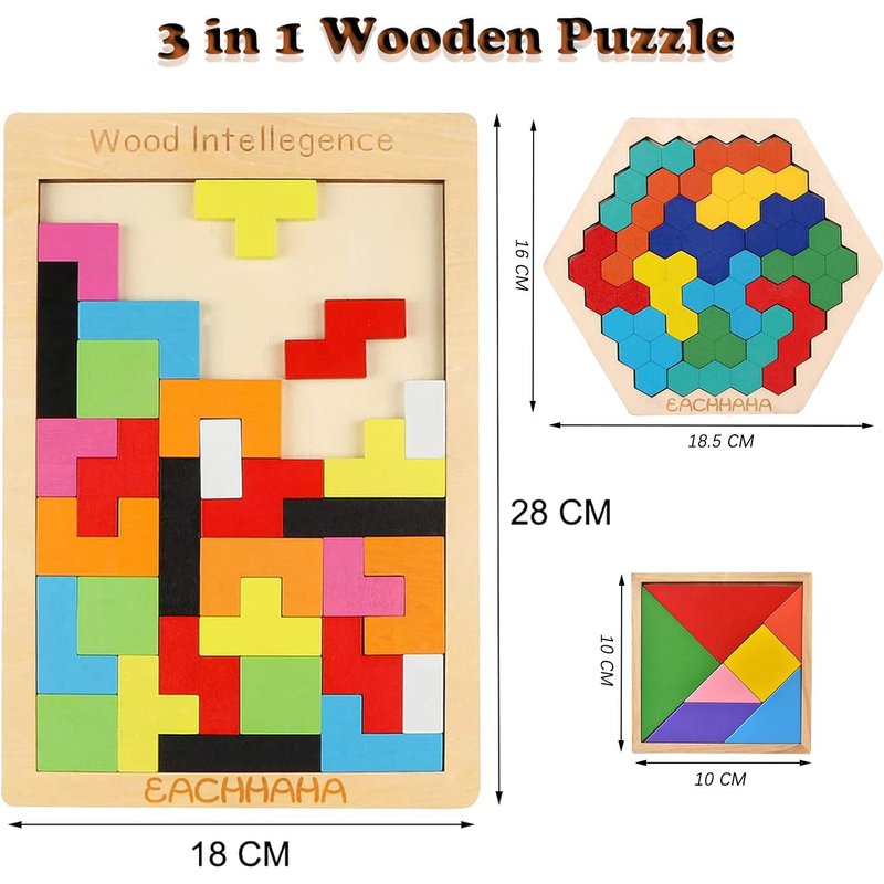 EACHHAHA 3-in-1 Wooden Blocks Puzzle Set,Hexagon Wooden Puzzle + Wood Russian Blocks + Tangram Puzzle for Kids,Intelligence Brain Teasers Toy STEM Educational Gift for Children(With storage bag)