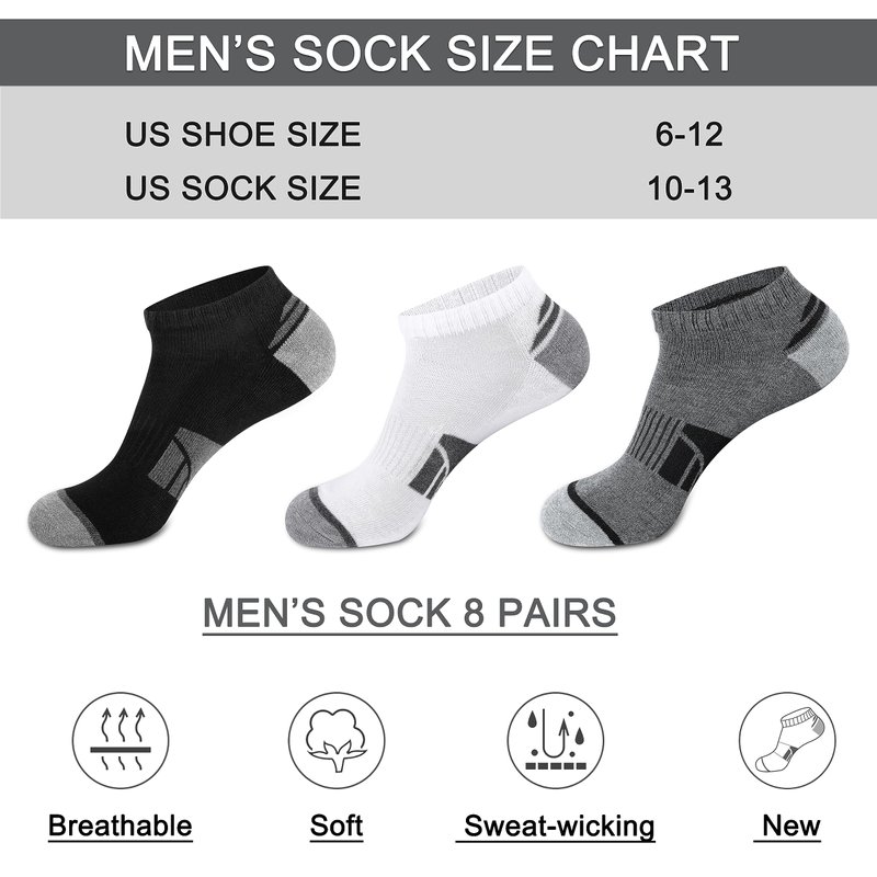 - Socks Size - Fits for US men sock size 10-13 (shoe size 6-12). Package: 8 pairs of mens low cut socks.
