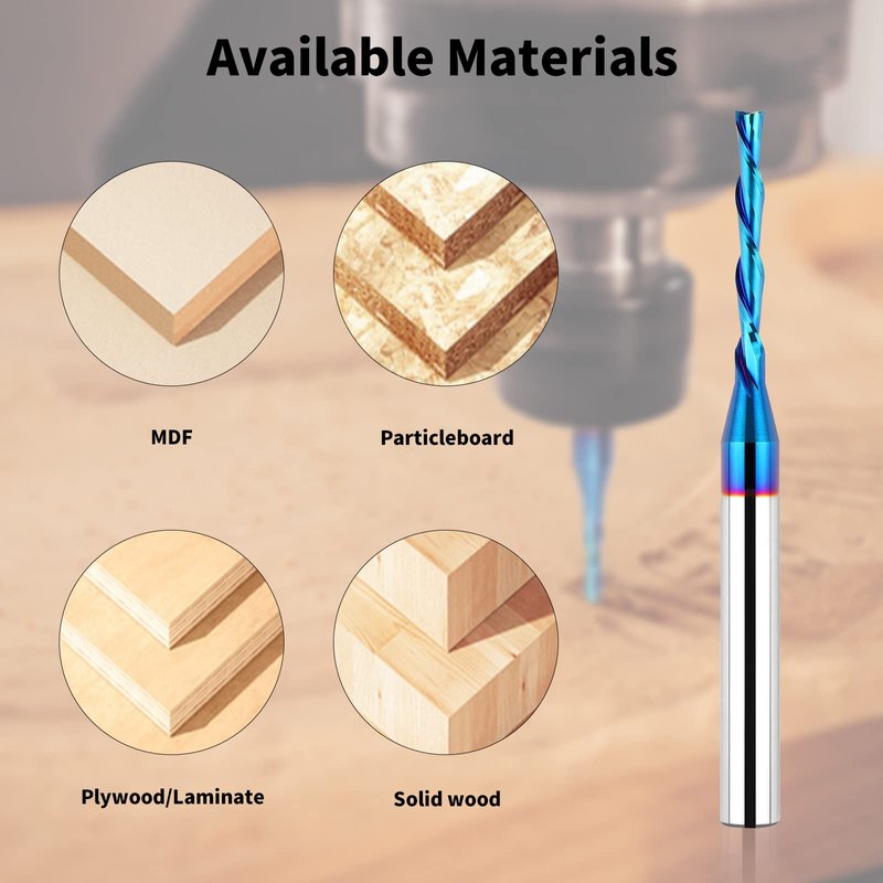 - SOLID CARBIDE AND NANO BLUE COATED: The down-cut spiral router bit is made of solid carbide. And Nano Blue Coating with high hardness and heat resistance enables the tool's cutting edge to retain crucial sharpness and lubricity. This provides longevity and produces cutting results of the highest quality. Clean surface, neat, no glitches.