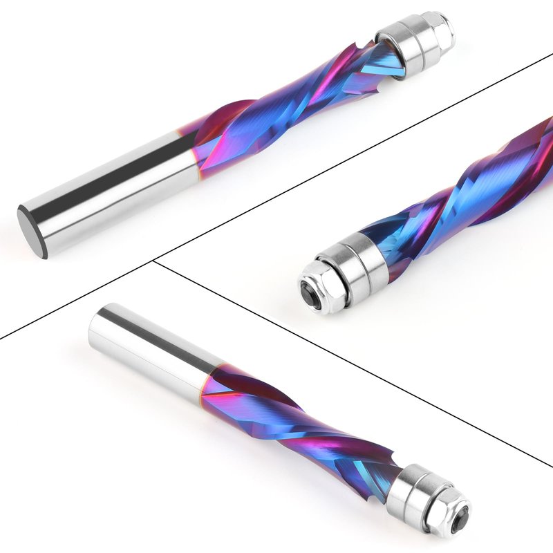 - SOLID CARBIDE AND NANO BLUE COATING: The CNC compression spiral flush trim router bit is made of solid carbide. And Nano Blue Coating with high hardness and heat resistance enables the tool's cutting edge to retain crucial sharpness and lubricity. This provides longevity and produces cutting results of the highest quality. Clean surface, neat, no glitches. Up to 2.5X longer life compared to uncoated bits.