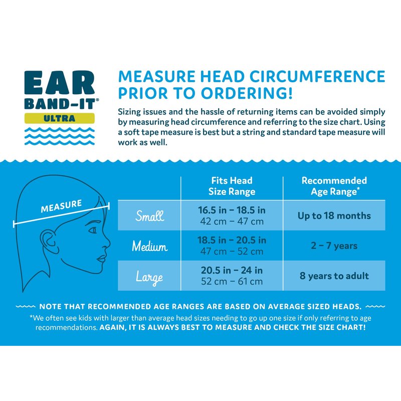 THIS EAR BAND-IT ULTRA LISTING IS PACKAGED WITH 6 PAIRS OF WORLD FAMOUS FLOATING PUTTY BUDDIES EARPLUGS! Small/Medium packaged with matching plugs. Large packaged with tan plugs. BONUS! EACH PAIR OF EAR PLUGS COMES IN HANDY STORAGE CASE! The Ear Band-It Ultra is brought to you by the makers of the Original Ear Band-It headband, the ORIGINAL swimming headband. Developed by a board certified Ear, Nose & Throat Physician and designed to keep water out of the ears, providing maximum comfort and safety while swimming and bathing. After 20 years of development we are proud to introduce the new and improved Ear Band-It Ultra! EXTRA GRIP! Made with a custom inner lining that provides extra grip to avoid slipping off the head. Also made of a much more soft and comfortable neoprene material. Putty Buddies are THE WORLD’S ONLY FLOATING SOFT MOLDABLE SILICONE EARPLUGS! Putty Buddies feature a super soft silicone which are much more soft and comfortable than other earplugs. Invented by an Ear, Nose, Throat Physician and recommended by doctors worldwide. HELPS PREVENT SWIMMER’S EAR. HOW TO USE PUTTY BUDDIES silicone earplugs: DO NOT INSERT INTO EAR CANAL. Do not tear plugs at any time. Use the entire ear plug for each ear. If plug appears to separate or crack, please do not use or attempt to remold together. Discard and use a new pair. Shape into a ball and place over clean, dry ear canal. Flatten plug with finger and shape to cover outer ear until snugly fit. DO NOT FORCE INTO EAR CANAL. Remove plugs by pressing up on back of the ear. Discard after 2 weeks of use or when dirty. Apply, use, and remove with adult supervision.